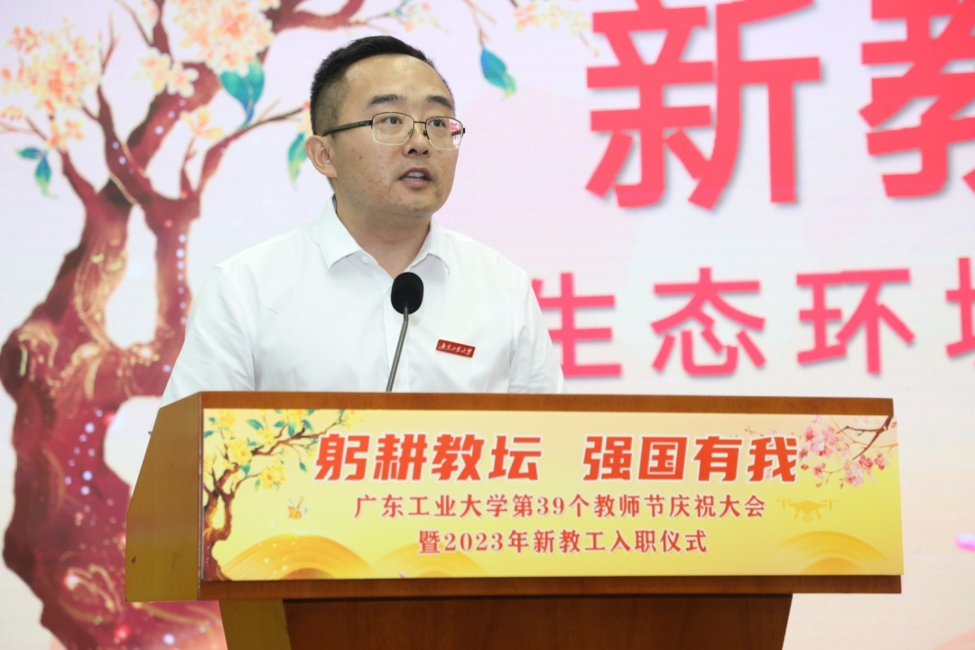 生态环境与资源学院程冠辉教授作为新教工代表发言。成为广工大家庭的一员他倍感荣幸和自豪,将以“忠诚服务奖”前辈为榜样,传其精神、承其宏志,始终胸怀天下、心系学校,尽心尽责、勤恳踏实,厚德爱生、律己宽人,为广工的发展、湾区的建设、国家的复兴倾其所有、献其终生。