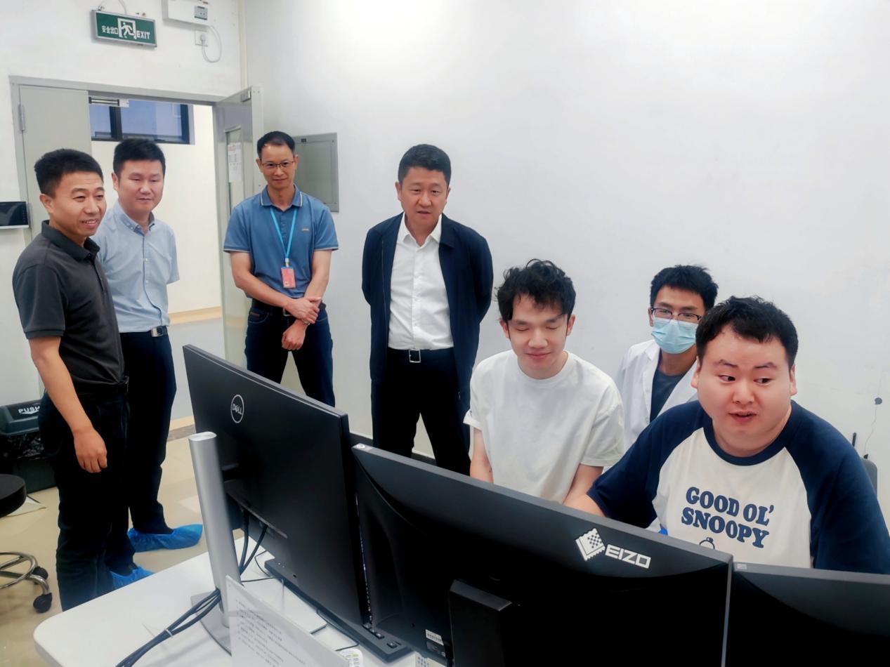 调研过程中,白建刚深入实验室,实地察看了大型仪器设备配置与运行状况,与一线分析测试人员交流大家的工作情况和具体分管设备的使用情况,重点听取了霍延平主任关于中心日常管理运行机制、服务科研情况及双球差电镜试运行情况的汇报。