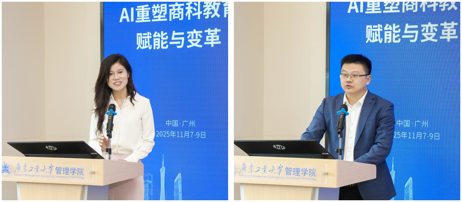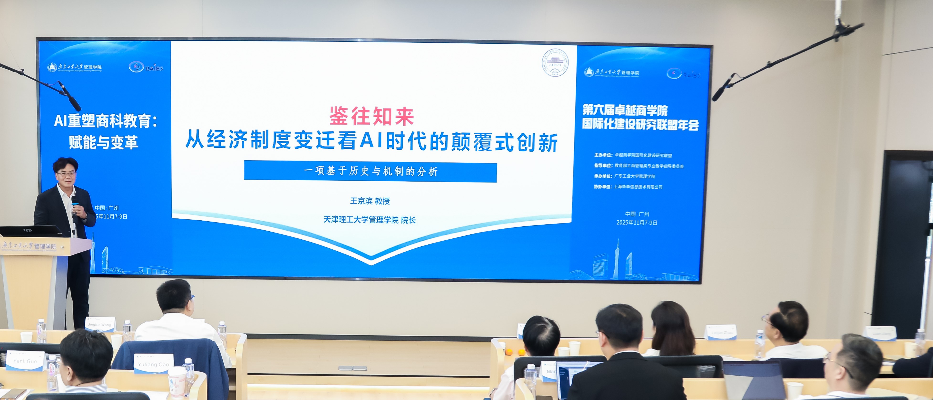 下午,广东外语外贸大学丁浩教授主持了主旨报告的第三部分。北京联合大学江晶晶教授从全球化-本土化的视角探讨了AI赋能商学院的发展路径;天津理工大学王京滨教授通过经济史和机制的分析提出通过经济制度转型探索AI时代的颠覆式创新;九州·体育(中国)官方网站奚菁教授系统介绍了广工 MBA人才培养的“管工融合五星模式”创新与实践。