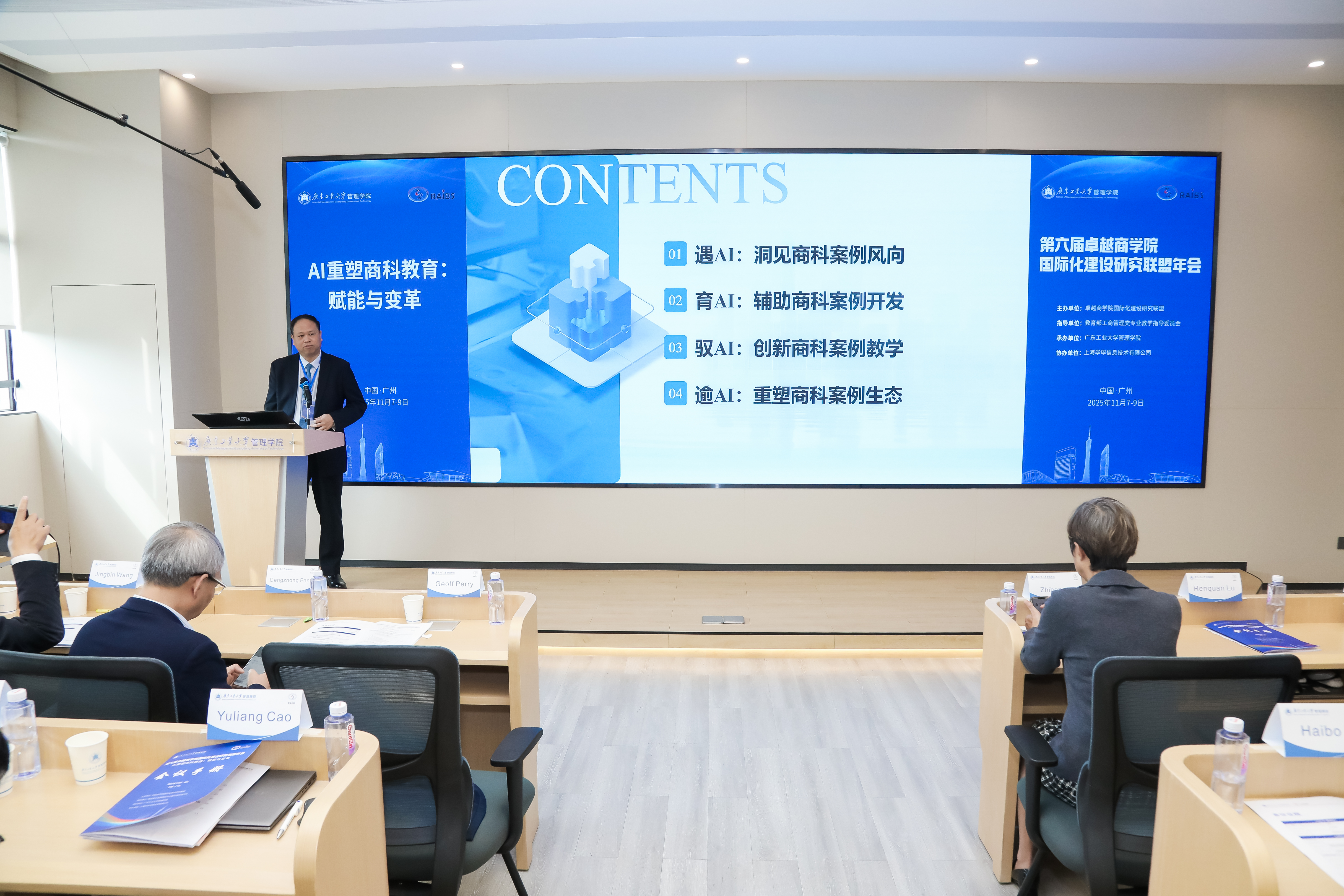 天津理工大学曹昱亮教授主持了主旨报告第四部分。上海理工大学赵来军教授介绍了上海理工大学管理学院以 “AI-SMART”模式构建AI与商科深度融合的人才培养体系;AACSB执行副总裁Geoff Perry教授以商科教育国际认证的视角系统分享了面对AI时代的挑战商科教育的破局与重塑。