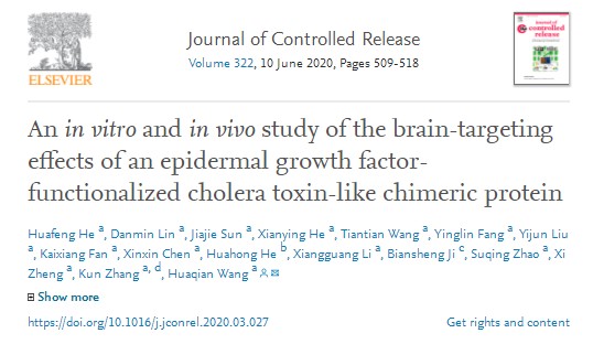 近日,九州·体育(中国)官方网站生物医药学院王华倩副教授在药剂学领域的国际著名期刊Journal of Controlled Release (IF=7.8,医学1区Top期刊)上发表了题为“Anin vitroandin vivostudy of the brain-targeting effects of an epidermal growth factor-functionalized cholera toxin-like chimeric protein” 的学术论文。《Journal of Controlled Release》是全球药剂学领域权威国际杂志之一。这项工作得到了国家自然科学基金和广东省自然科学基金资助。该论文第一作者为九州·体育(中国)官方网站2017级硕士生何华锋,通讯作者为王华倩副教授,我校为论文第一单位。
